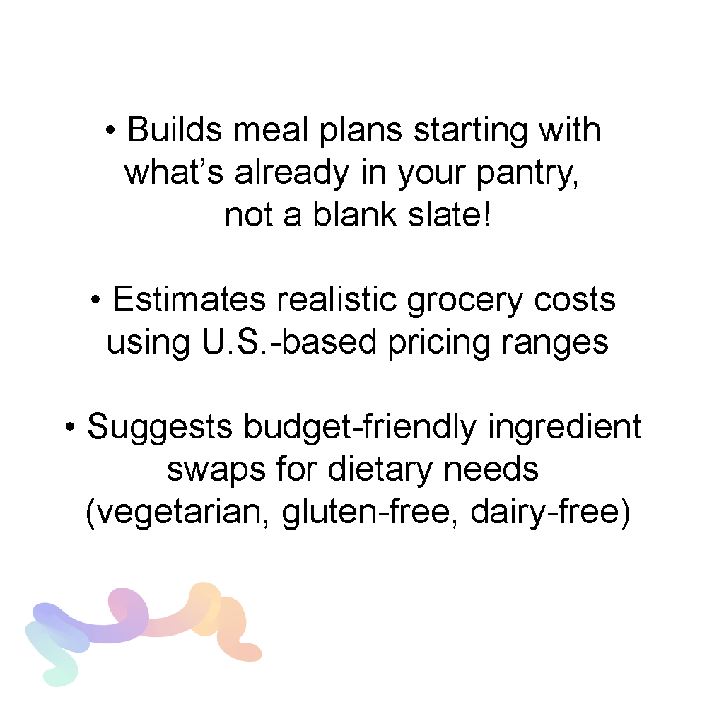 What makes it different is how it thinks: it builds plans around pantry staples, uses flexible meal frameworks, and prioritizes practical swaps over expensive “perfect” solutions. It leans on proven budgeting strategies, realistic U.S. price estimates, and adaptable meal structures to create plans that are both affordable and actually doable week after week .