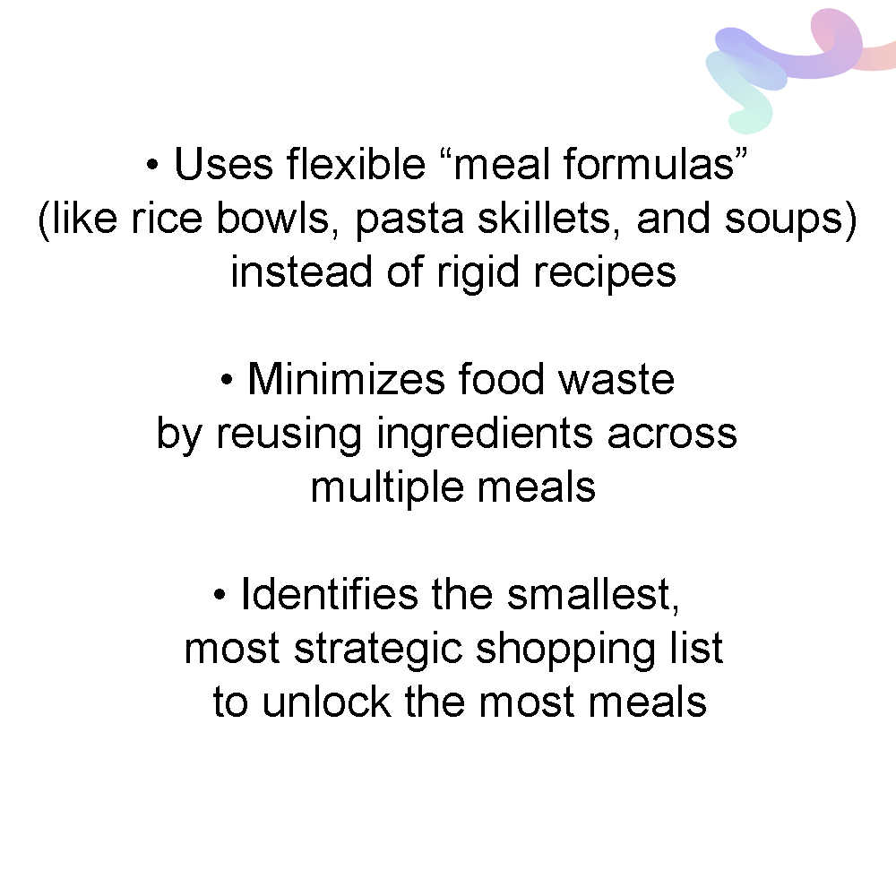 - Identifies the smallest, most strategic shopping list to unlock the most meals