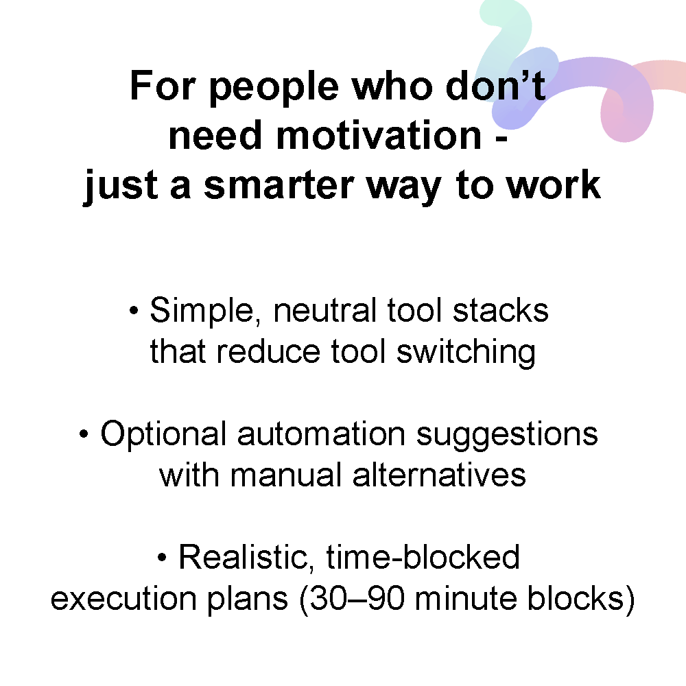 is a focused execution system designed for creators and solopreneurs who don’t need more ideas—they need clarity. It takes messy goals, half-built processes, or stalled projects and turns them into clean, step-by-step workflows that are realistic to execute. Every output is designed to reduce friction, decision fatigue, and overthinking.