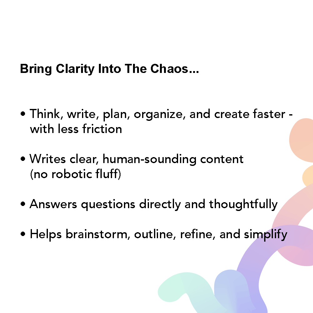 Think of it as a calm, capable digital partner that helps turn messy thoughts into structured output, half-formed ideas into polished content, and big goals into doable next steps.